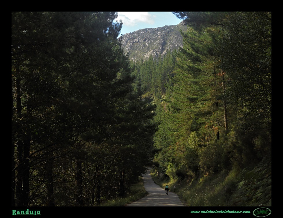 Embelesados vamos a coronar este kilómetro que, no por bello deja de ser duro, y aún en pleno disfrute del entorno, en raudo descenso nos vamos adentrar, por no decir incrustar, un bosque. Tal vez sea por efecto de su vecindad, pero el caso es que advertimos una sensación de que el pinar y su altura empequeñecen la carretera y el ciclista que ni siquiera las montañas nos habían hecho notar nunca.
