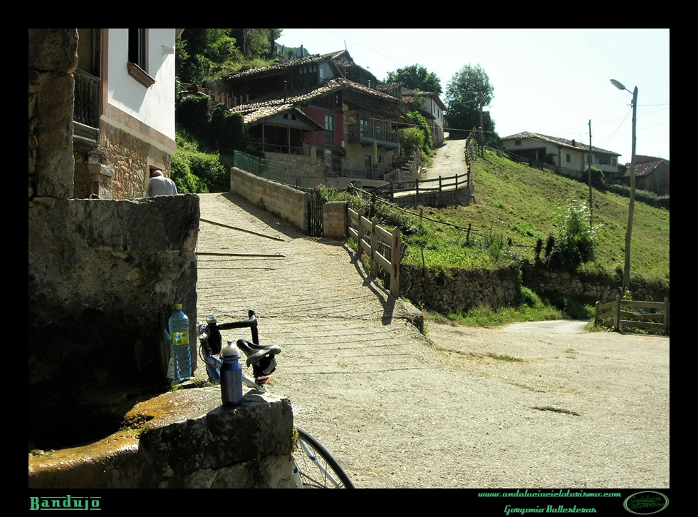 Y fue aquí, en el alto, donde decidimos volver nuestras pedaladas dejándonos caer plácidamente hacia la fuente de Proacina, ignaros de que aún nos faltaba la mejor parte de la ruta más allá del puerto: el pueblo de Bandujo (o Banduxu según lengua local). Poco menos de dos km. descendentes y en falso llano es la distancia sólo entre su cima y la parroquia, una suerte de diseminado de aldeas o barrios no demasiado dispersos entre sí recostados sobre la falda sur del Picu Cadiellos.