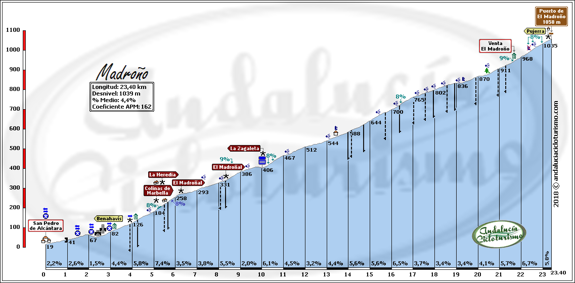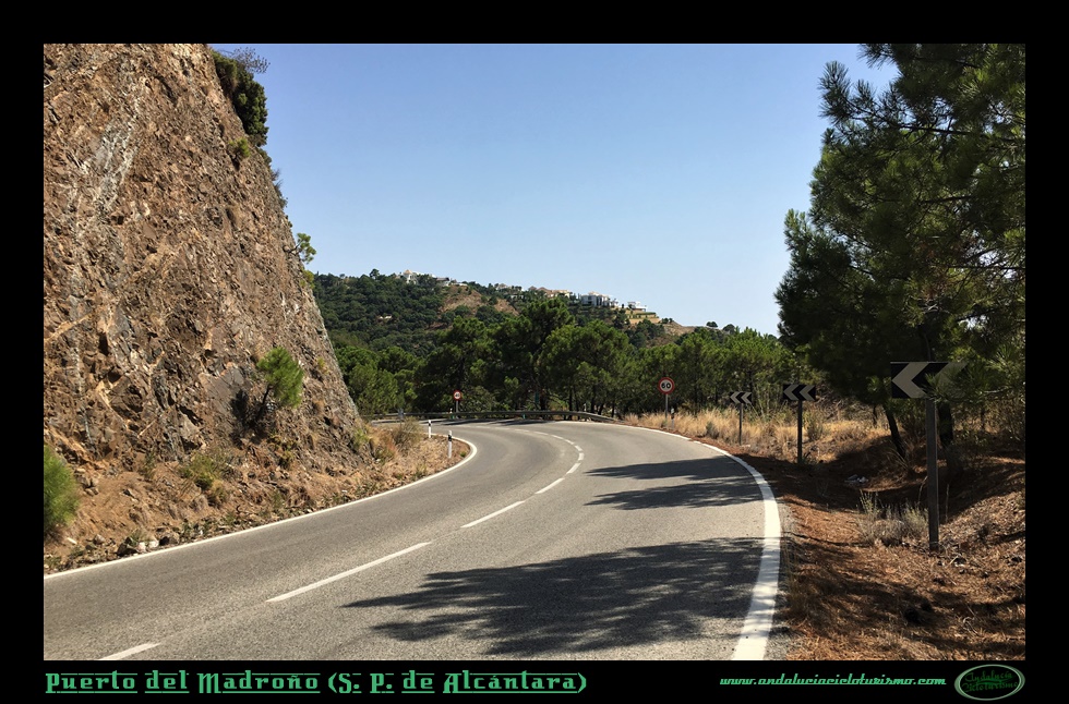 Las inmediaciones de San Pedro de Alcántara albergan el inicio de una de las subidas más concurridas de la Costa del Sol, el puerto del Madroño. Se trata de un ascenso largo, de más de 20 km. si lo comenzamos en las inmediaciones de la A-7, que conecta Marbella y sus alrededores con Ronda. Este hecho es lo que marca todo el ascenso de un puerto que, por otra parte, nos parece -permítasenos la expresión- absolutamente babeante.