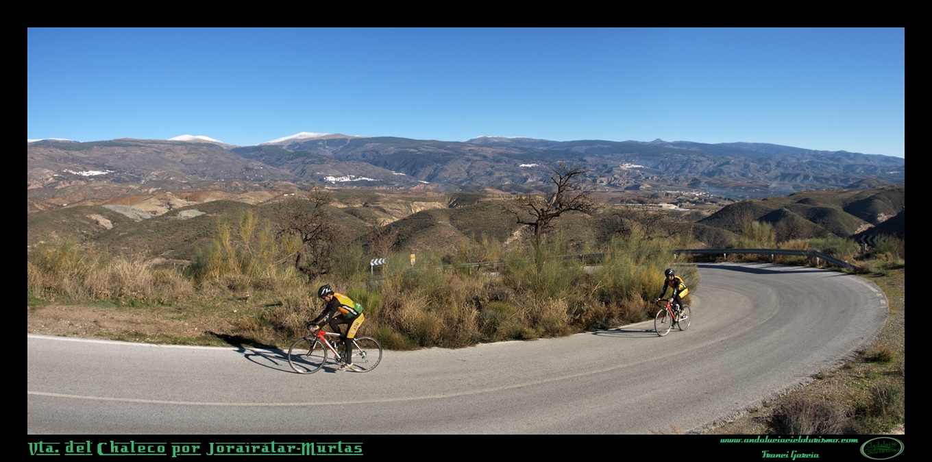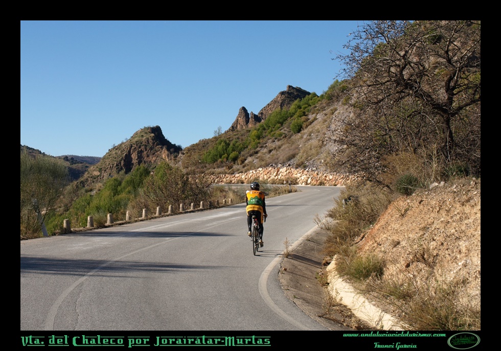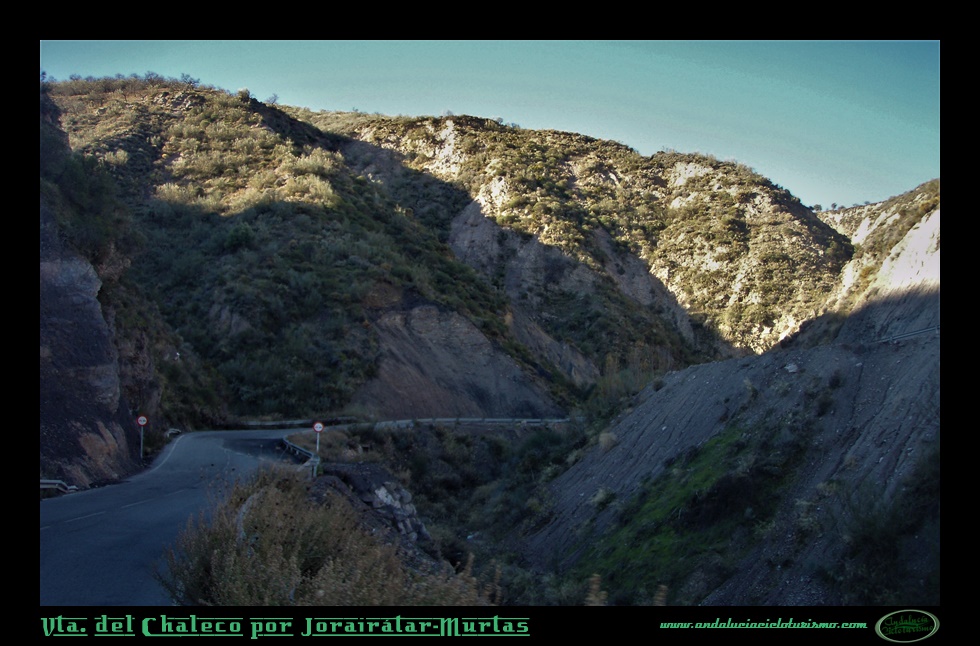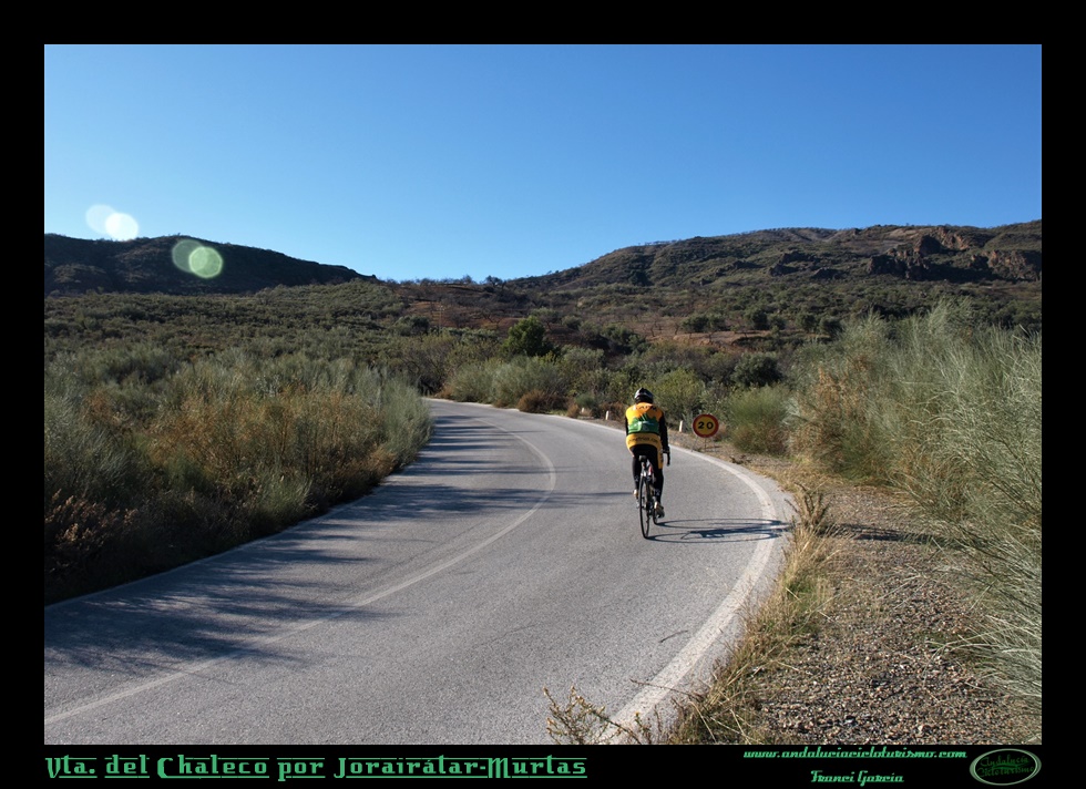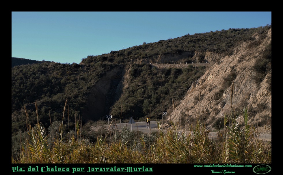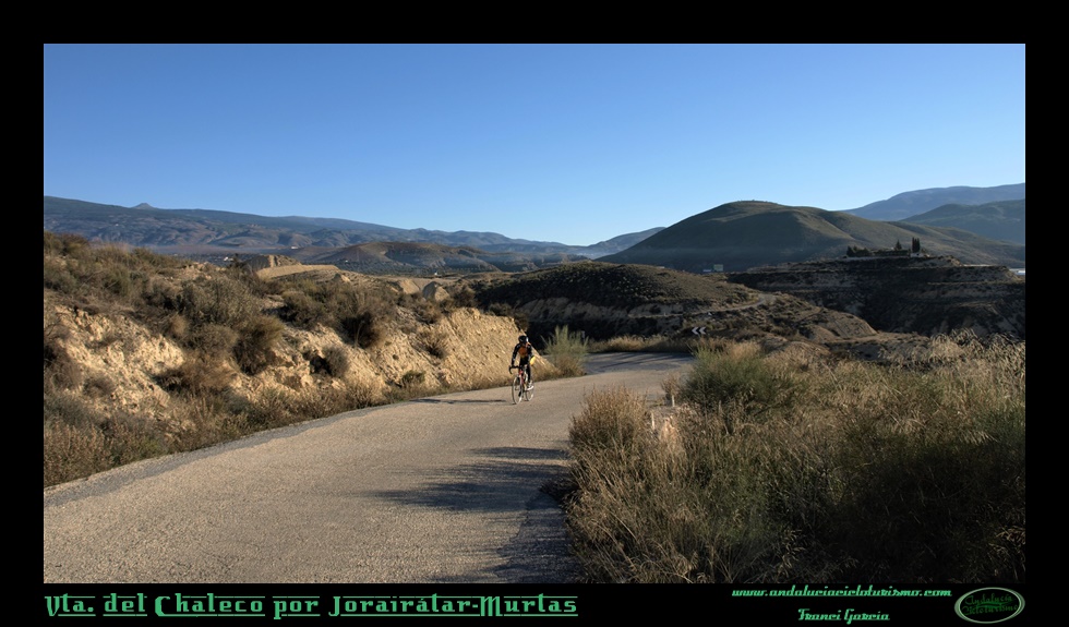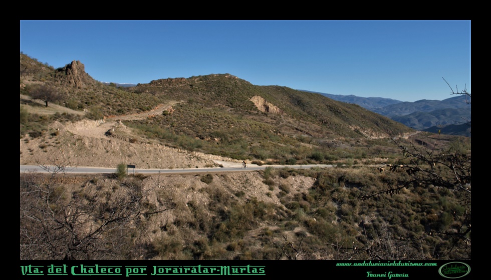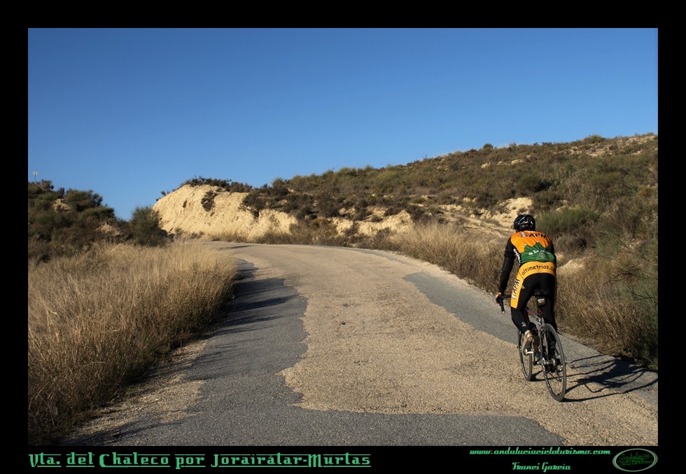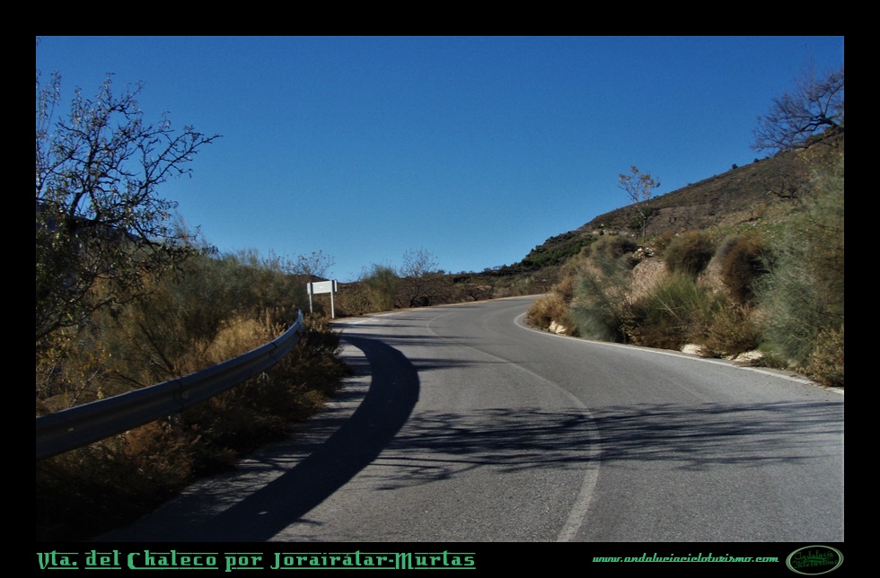 A continuación proponemos una de esas subidas irregulares, sin fuertes pendientes, pero de larga distancia, de las que merecen la primera categoría por el mero desgaste que supone su ascenso. Y eso que hemos de notar que esta vertiente de Jorairátar y Murtas que corona la Venta del Chaleco es la de menor dificultad de las tres existentes, siendo la sur la más exigente y, quizás, la del embalse de Benínar la más «cicloturista».