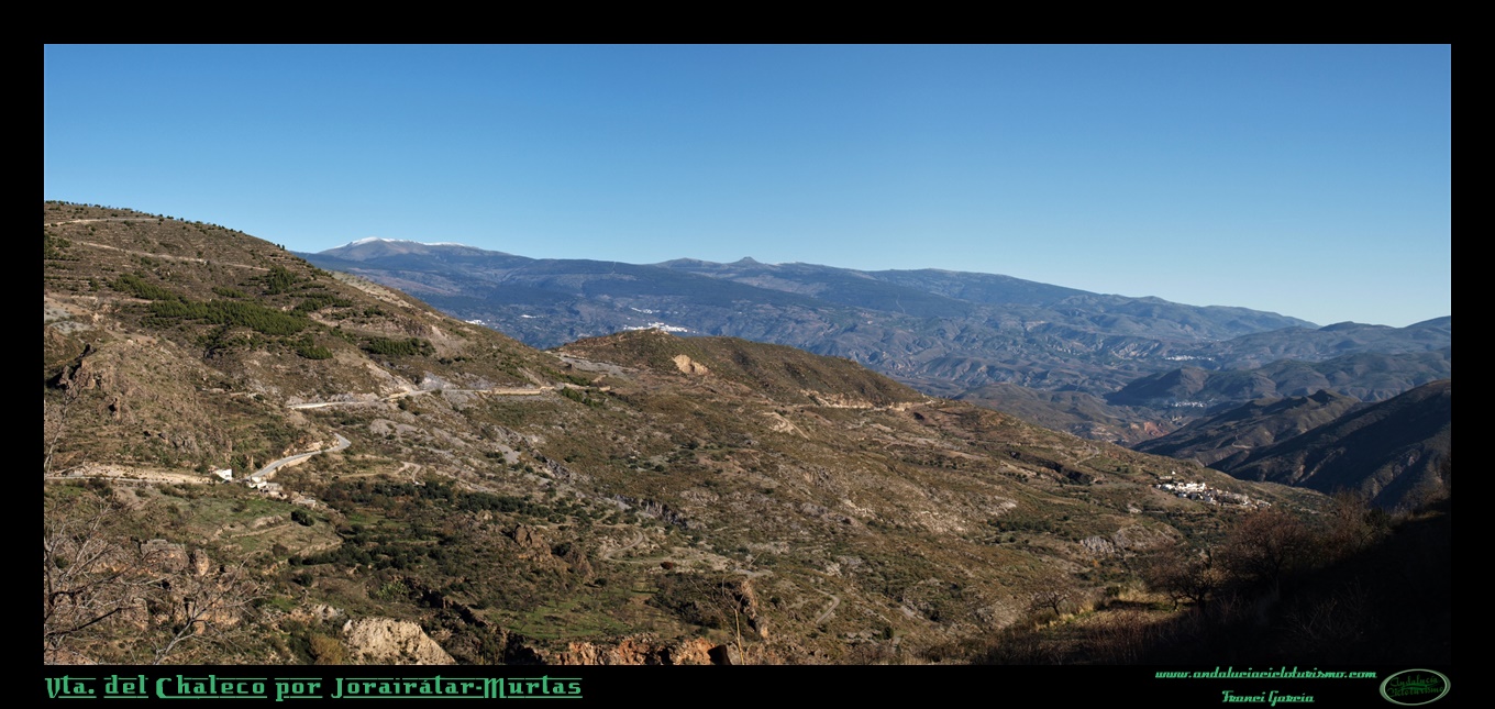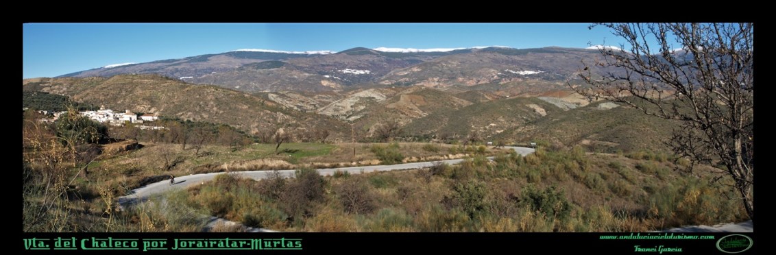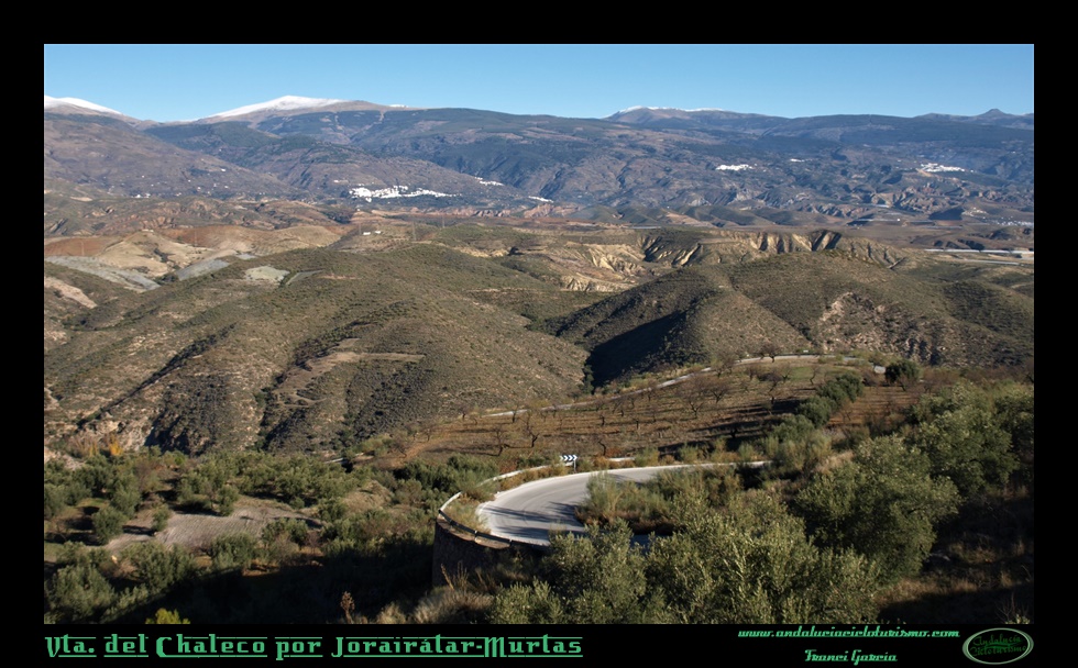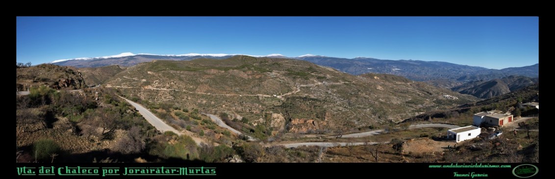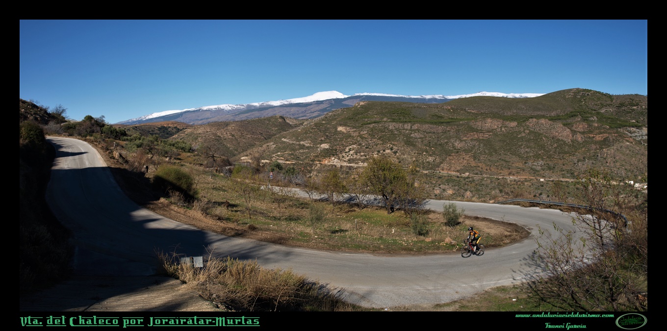 Y, en éstas… una curva de herradura y al punto otra y, entonces, la carretera se escalona zigzagueando ladera arriba. Se trata, quizás, del tramo más divertido de la subida y también del más duro, aunque la dureza no llega a ser excesiva. Hasta nueve herradura hemos contabilizado en poco más de un kilómetro que nos sirven como balcón de la Alpujarra, Sierra Nevada y Sierra de Gádor, con Jorairátar como población más cercana.