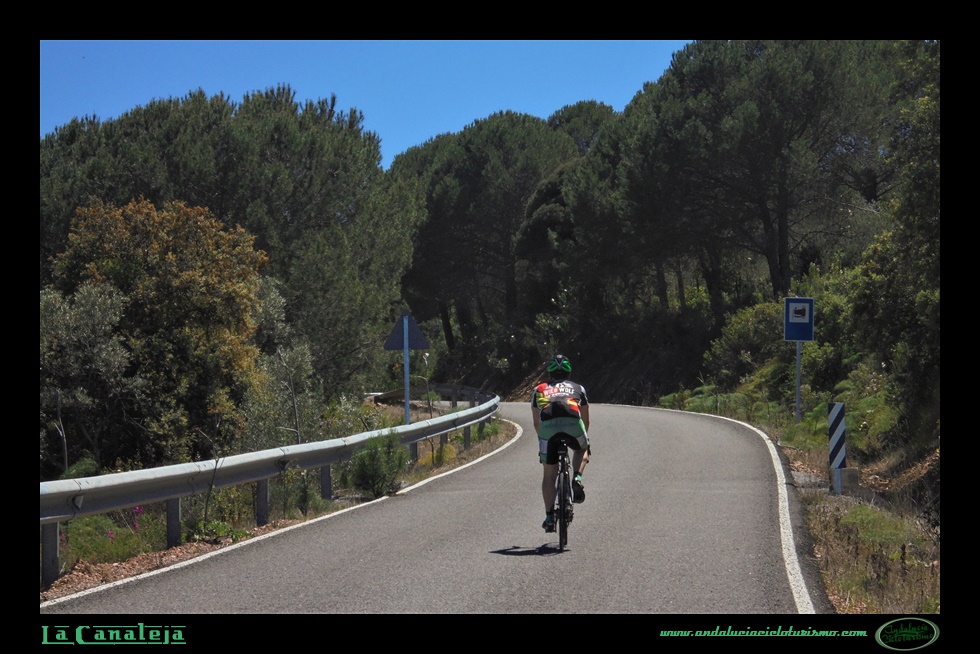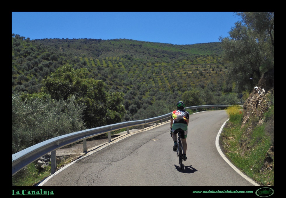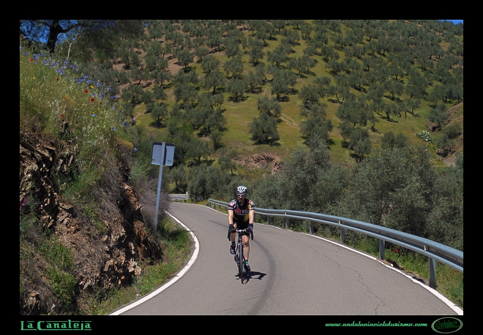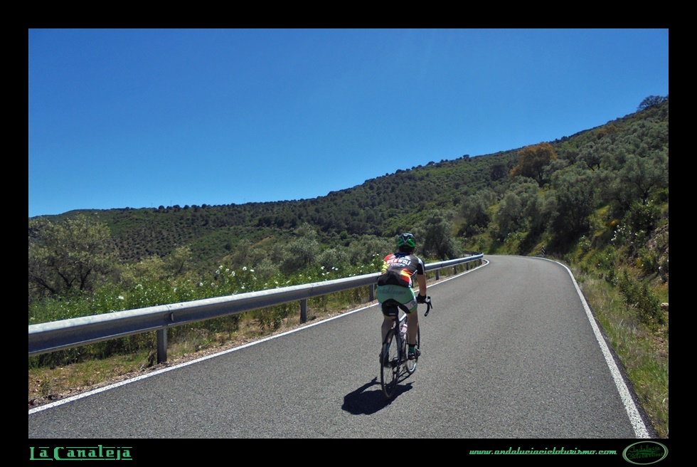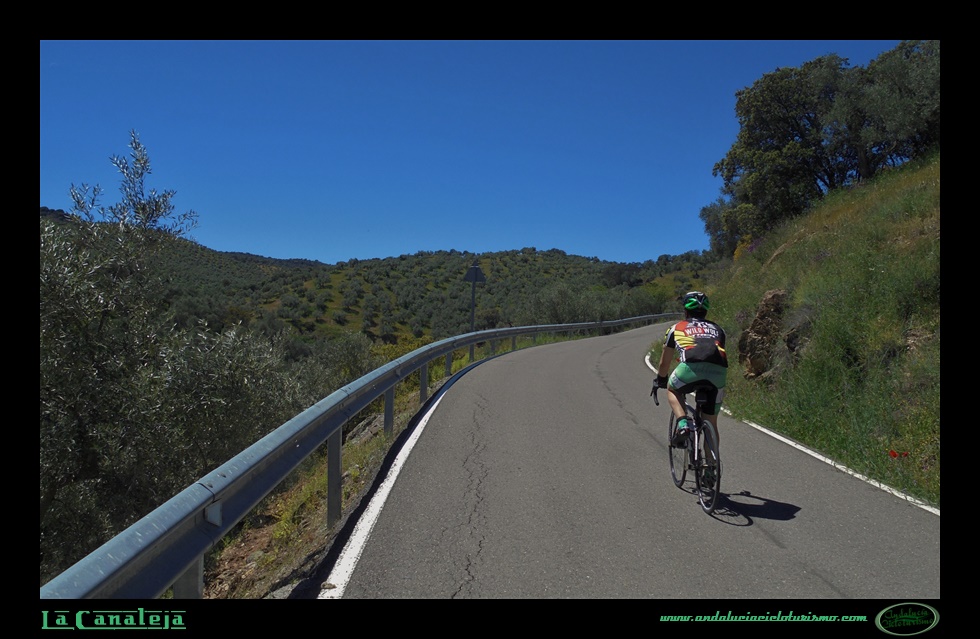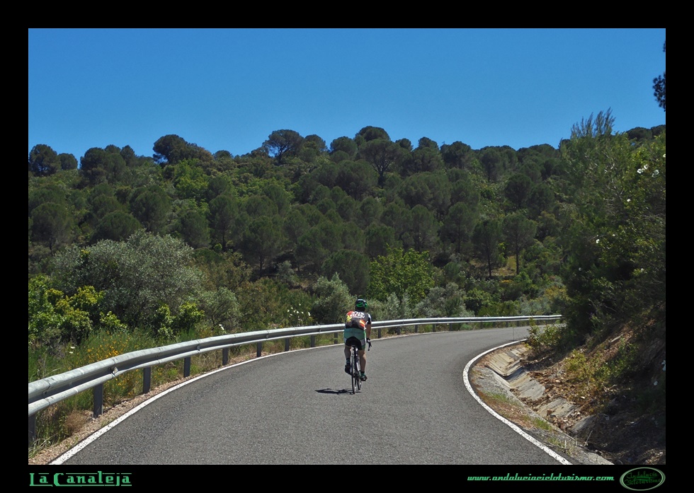 El inicio del ascenso consiste en un constante culebreo de la carretera hasta que, por fin, llegados a la entrada del Cortijo de La Canaleja, tras una cerrada curva a derechas, el trazado torna ligeramente rectilíneo, dentro de lo que cabe en una carretera de montaña, claro está.
