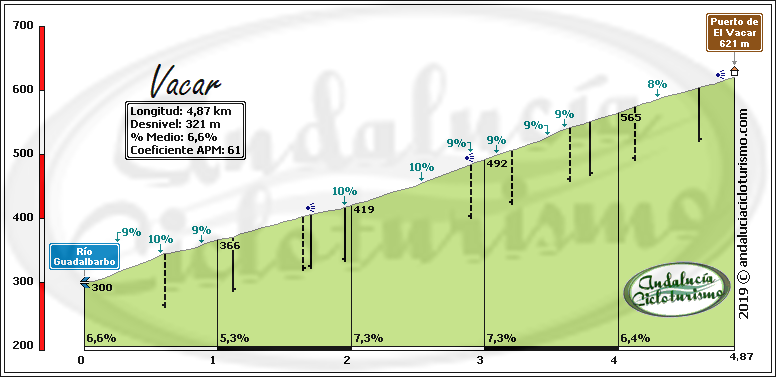 Salta a la vista que la subida a El Vacar no es ningún coloso ni nada comparable. A duras penas podríamos decir que se trata de un puerto de segunda y no de tercera categoría. Pero ello es tan cierto, como que sus casi cinco kilómetros obsequian al cicloturista con una terraza de espaciosas vistas.