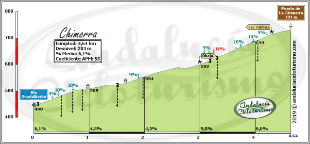 Aunque cuenta con alguna rampa dura e incluso todo un kilómetro al 9% de pendiente media, La Chimorra es un puerto bastante pedaleable.