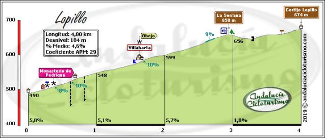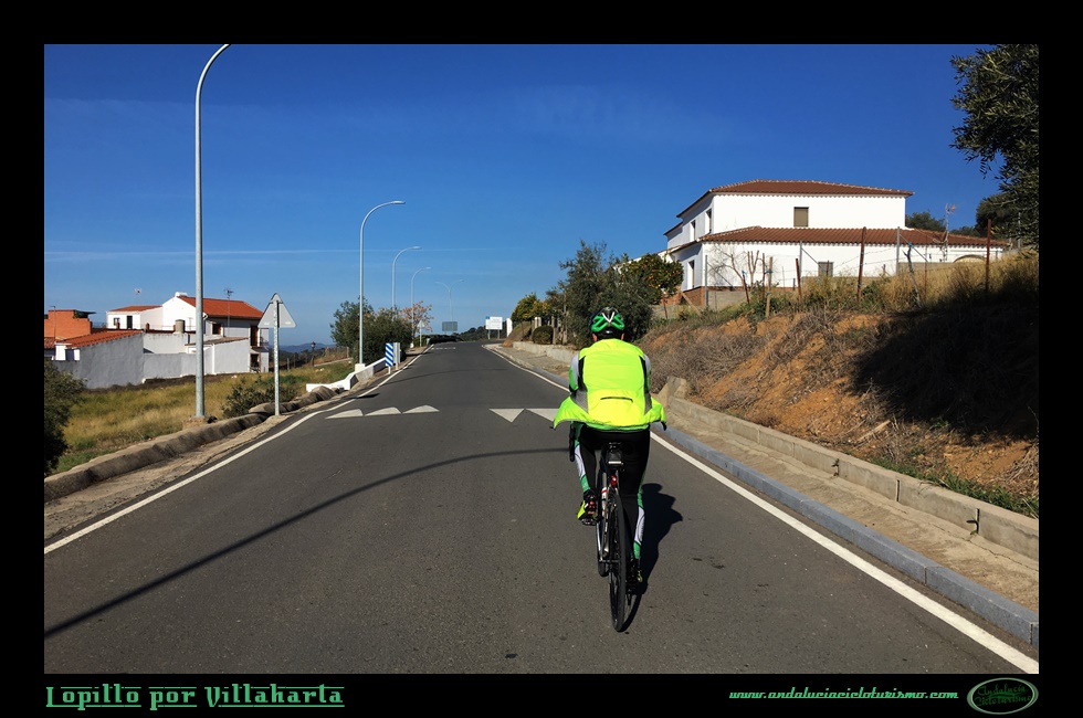 Tanto por la vertiente que se inicia en el río -algo más dura- como por la que atraviesa la misma localidad de Villaharta el ascenso al Lopillo no pasa de la tercera categoría. Se trata, en realidad, de uno de esos múltiples repechones que -puntuables o no en una carrera profesional- van dejando huella en las piernas del ciclista que completa ruta por la zona. Una de esas cuestas que, comparándolas con los puertos de mayor fuste, no parece gran cosa, pero que llegado el caso -antes o después- acaban pasando factura.