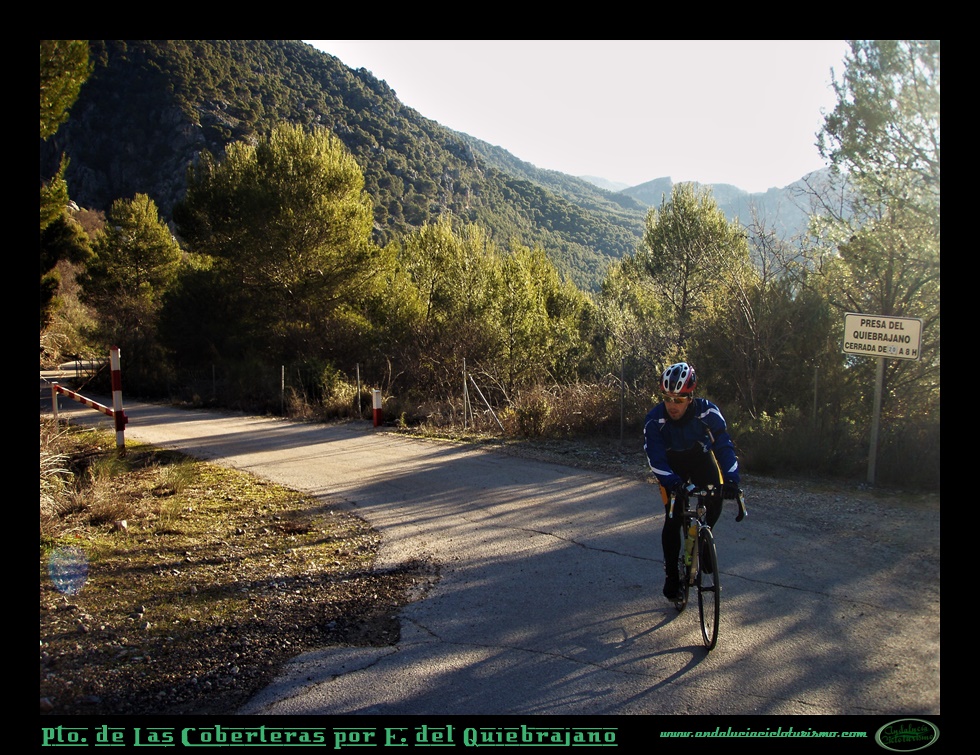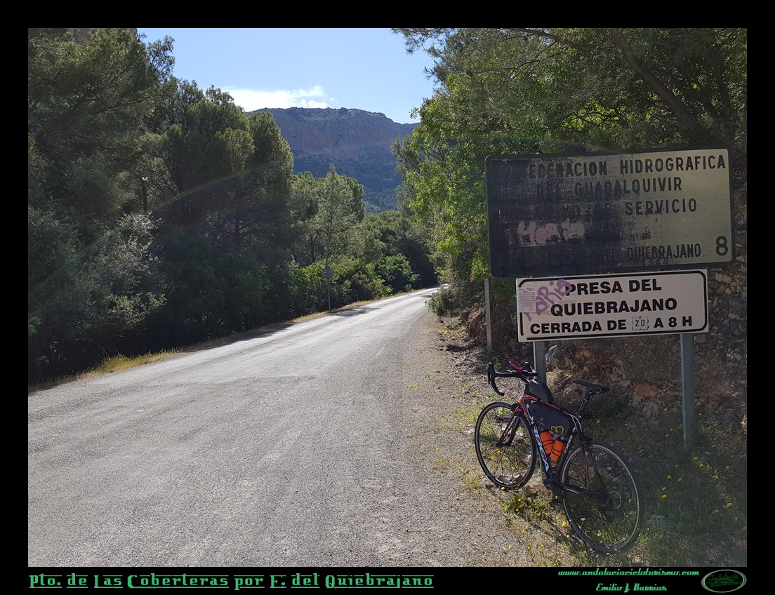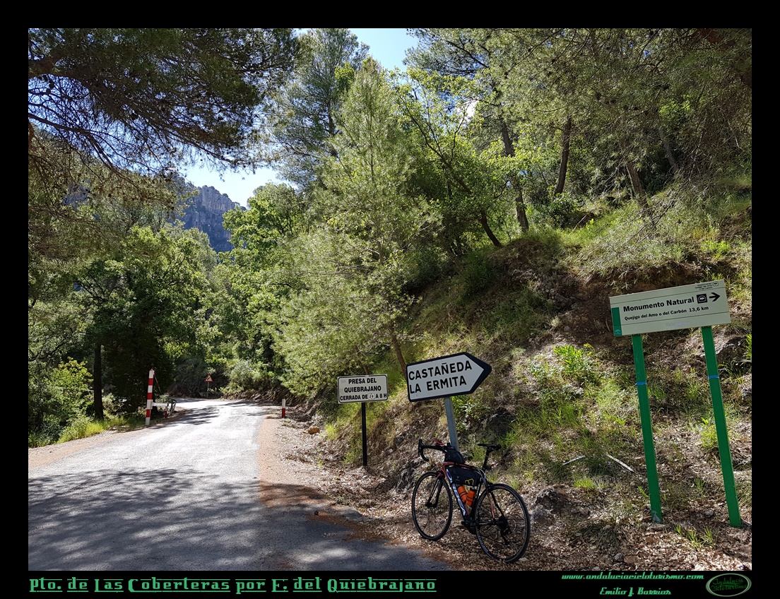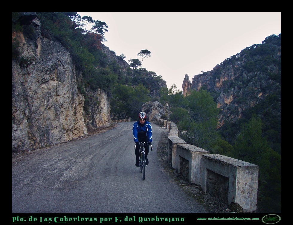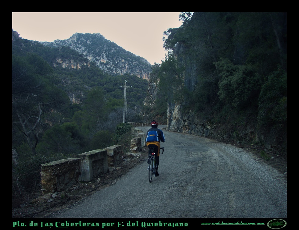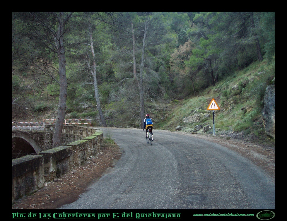 Casi sin tiempo para percibirlo, el olivar ha abandonado nuestro entorno amedrentado por lo angosto y abrupto del terreno dejando su sitio al pinar, que no se arredra ante semejantes adversidades orográficas. Pedaleamos rato ha junto al río Quiebrajano hasta que la carretera por fin vuelve a trepar levantándose sobre su cauce hasta alcanzar media ladera.