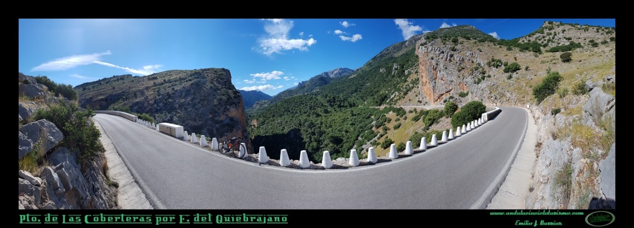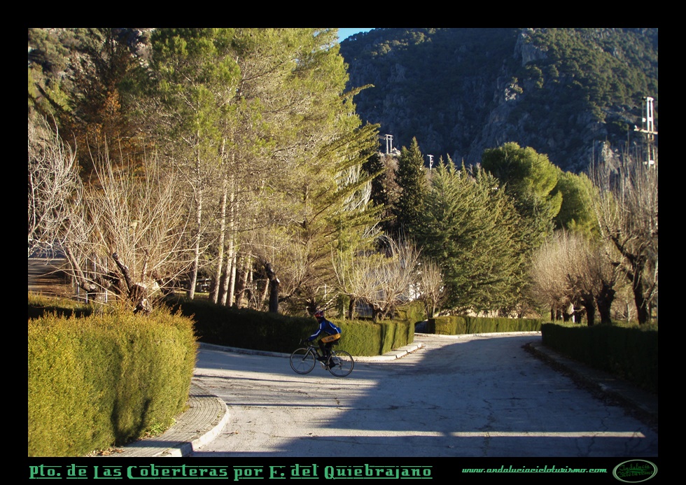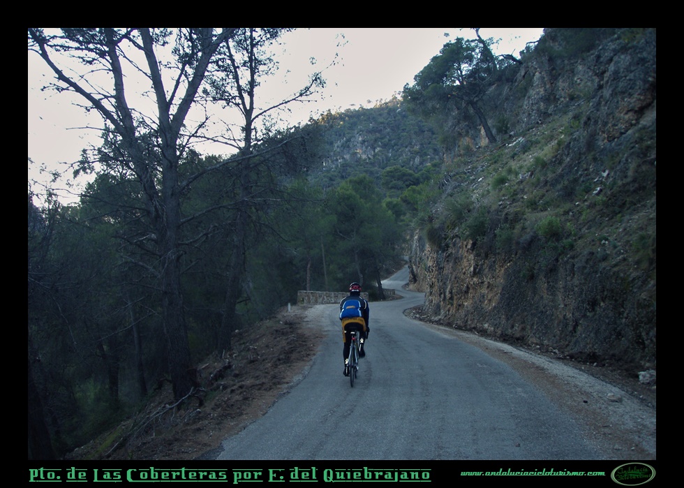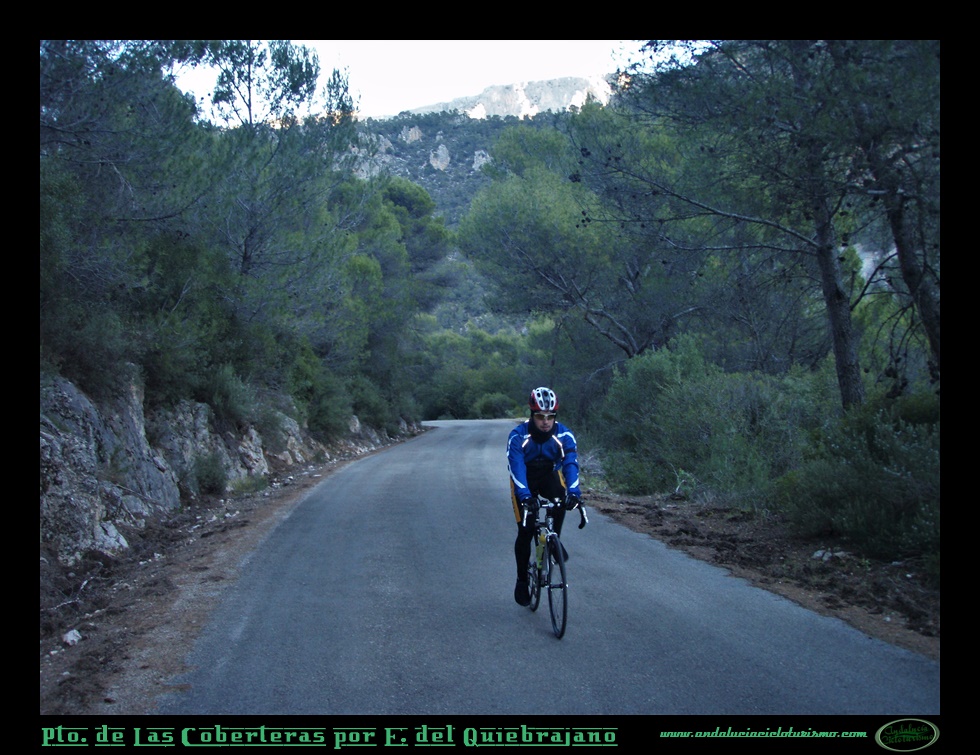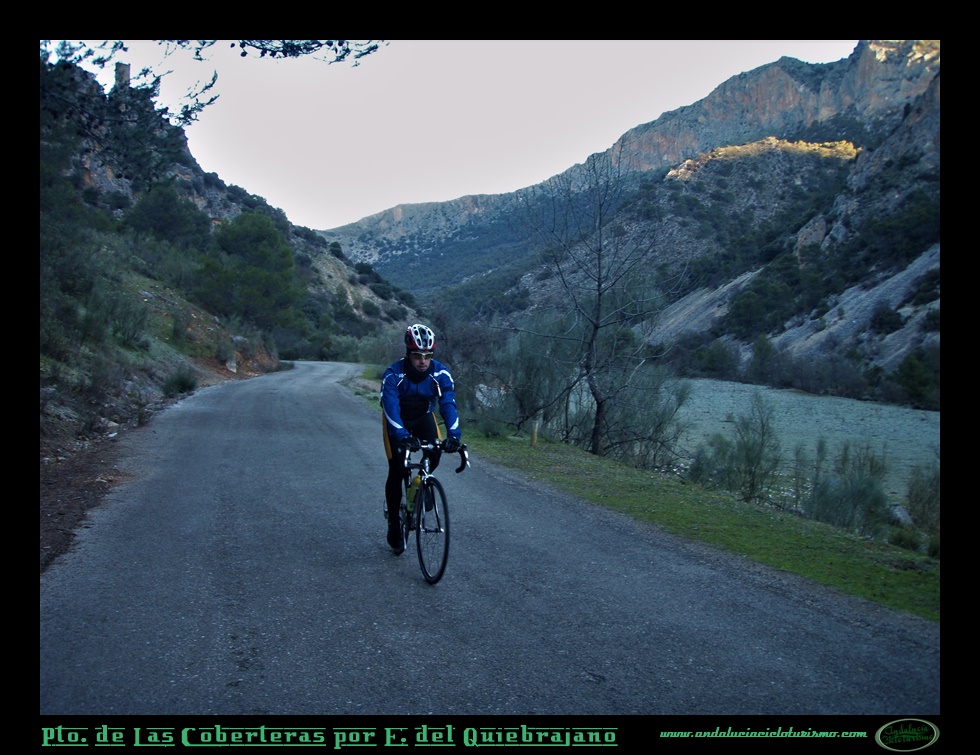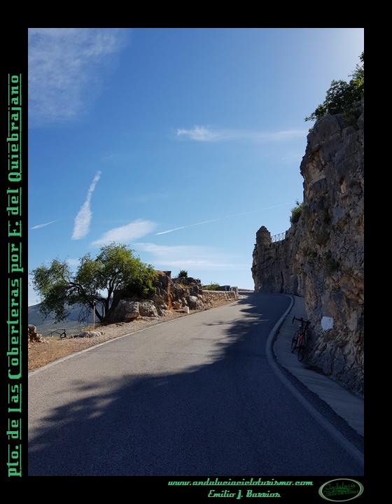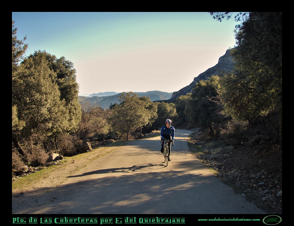 Casi sin tiempo para percibirlo, el olivar ha abandonado nuestro entorno amedrentado por lo angosto y abrupto del terreno dejando su sitio al pinar, que no se arredra ante semejantes adversidades orográficas. Pedaleamos rato ha junto al río Quiebrajano hasta que la carretera por fin vuelve a trepar levantándose sobre su cauce hasta alcanzar media ladera.