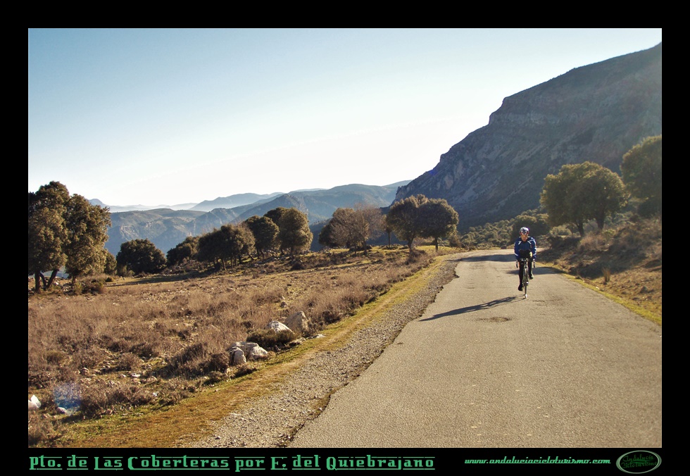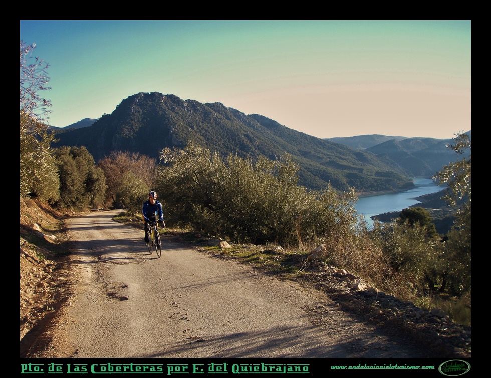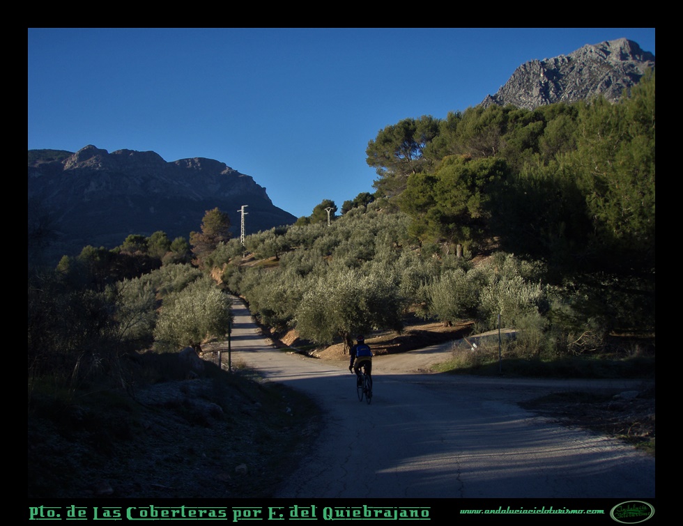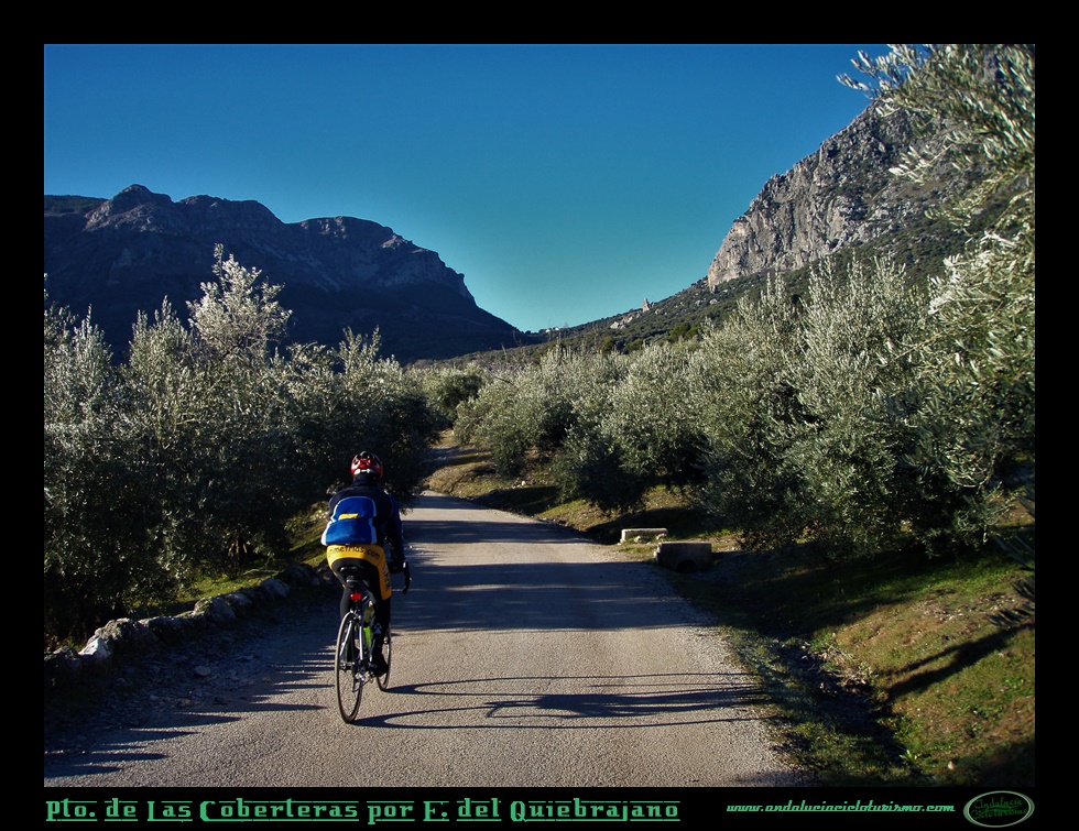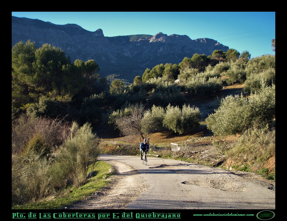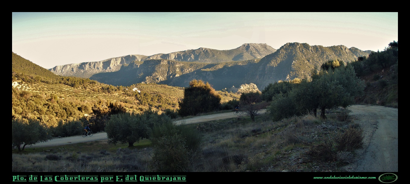 Superadas las rampas más duras, la carretera se abre paso ahora entre olivos al pie de la Sierra de la Pandera, que acapara nuestra atención hasta que tenemos visión directa hacia el embalse. Algo más adelante, entre las cumbres del alto de la Pandera y del Cerro de la Horca, atisbamos el amplio collado donde habremos de coronar Las Coberteras.