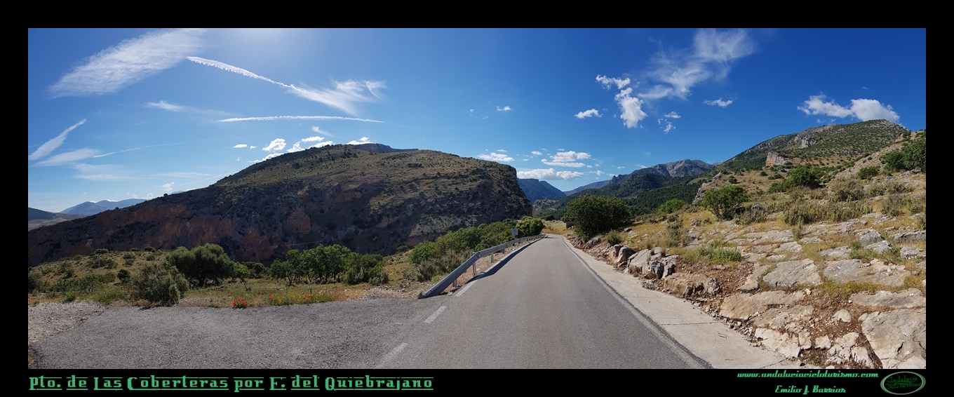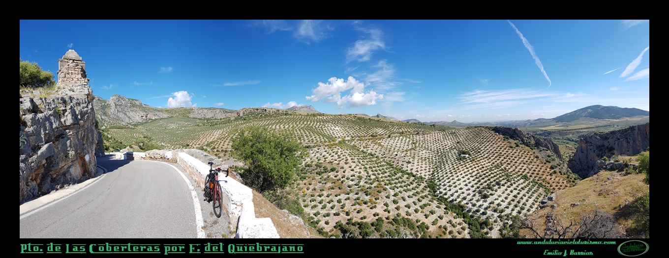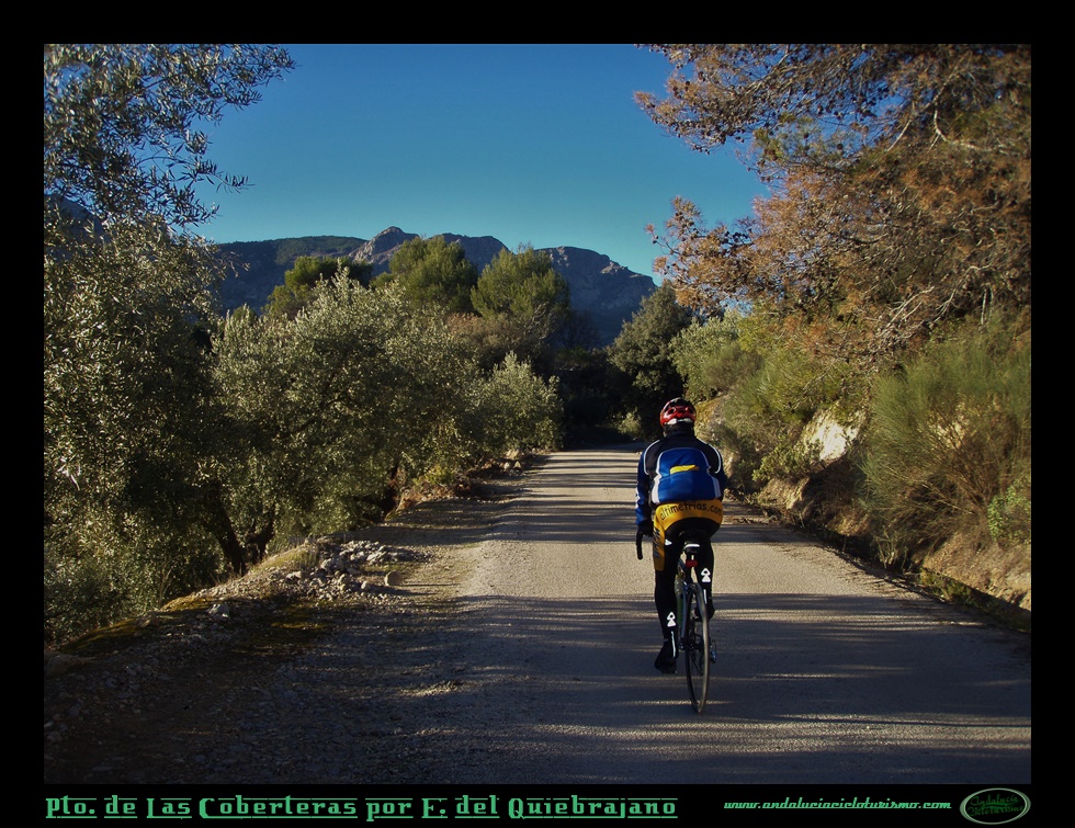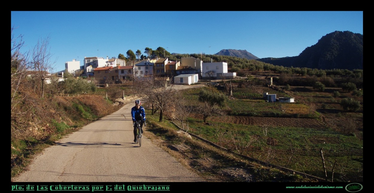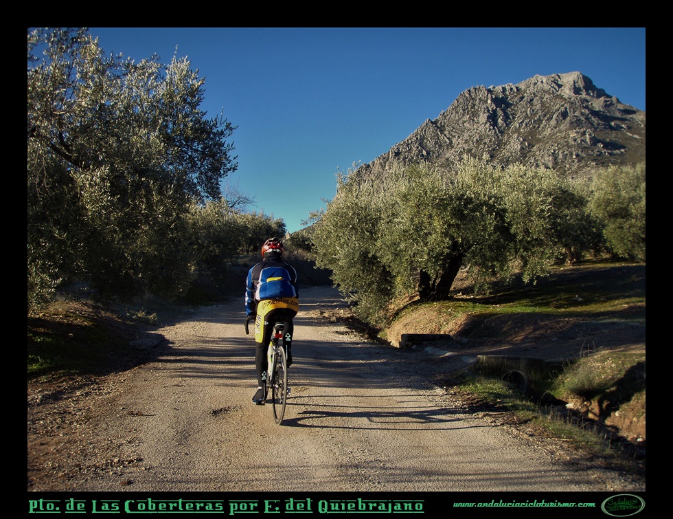 Superadas las rampas más duras, la carretera se abre paso ahora entre olivos al pie de la Sierra de la Pandera, que acapara nuestra atención hasta que tenemos visión directa hacia el embalse. Algo más adelante, entre las cumbres del alto de la Pandera y del Cerro de la Horca, atisbamos el amplio collado donde habremos de coronar Las Coberteras.