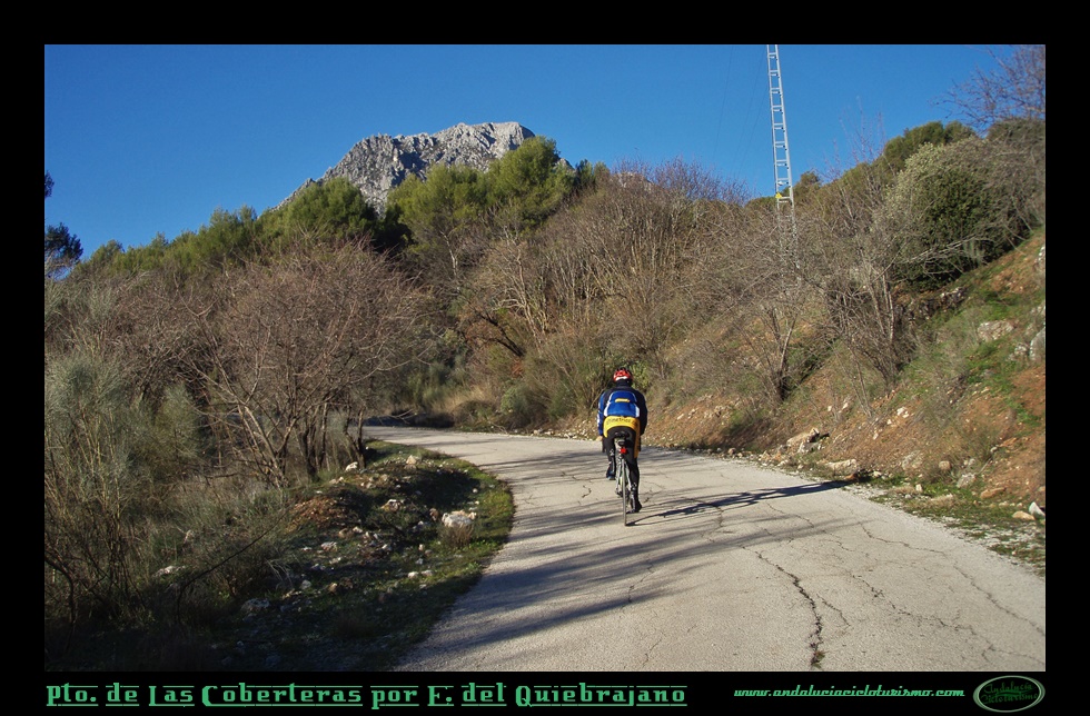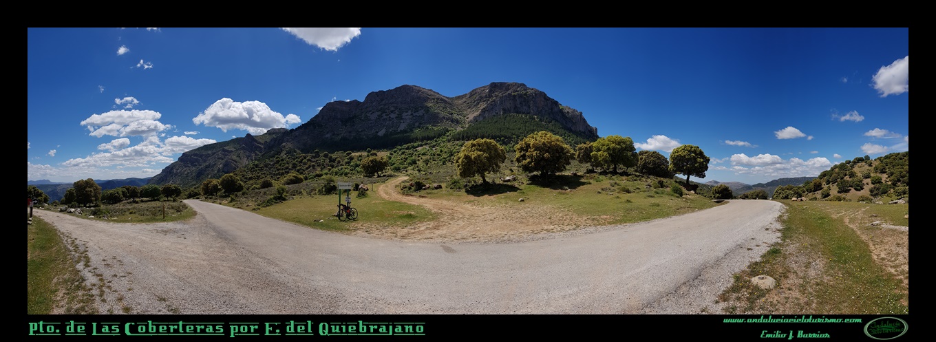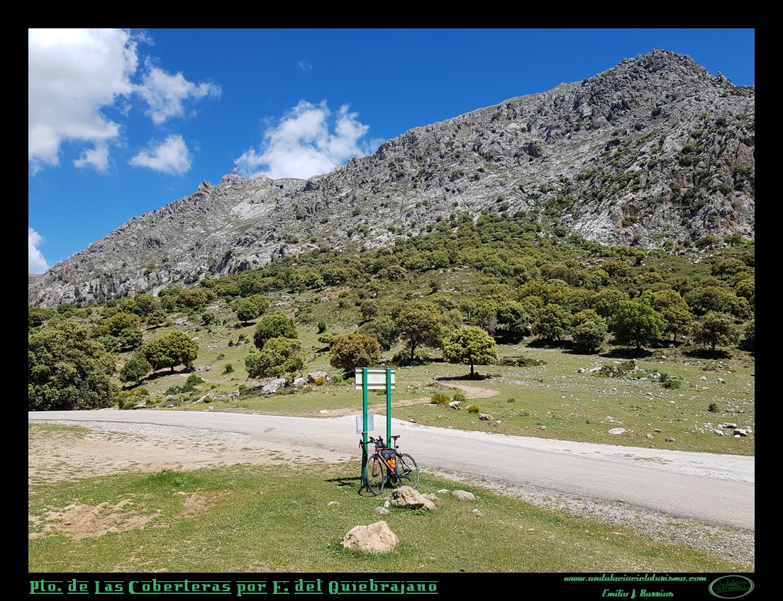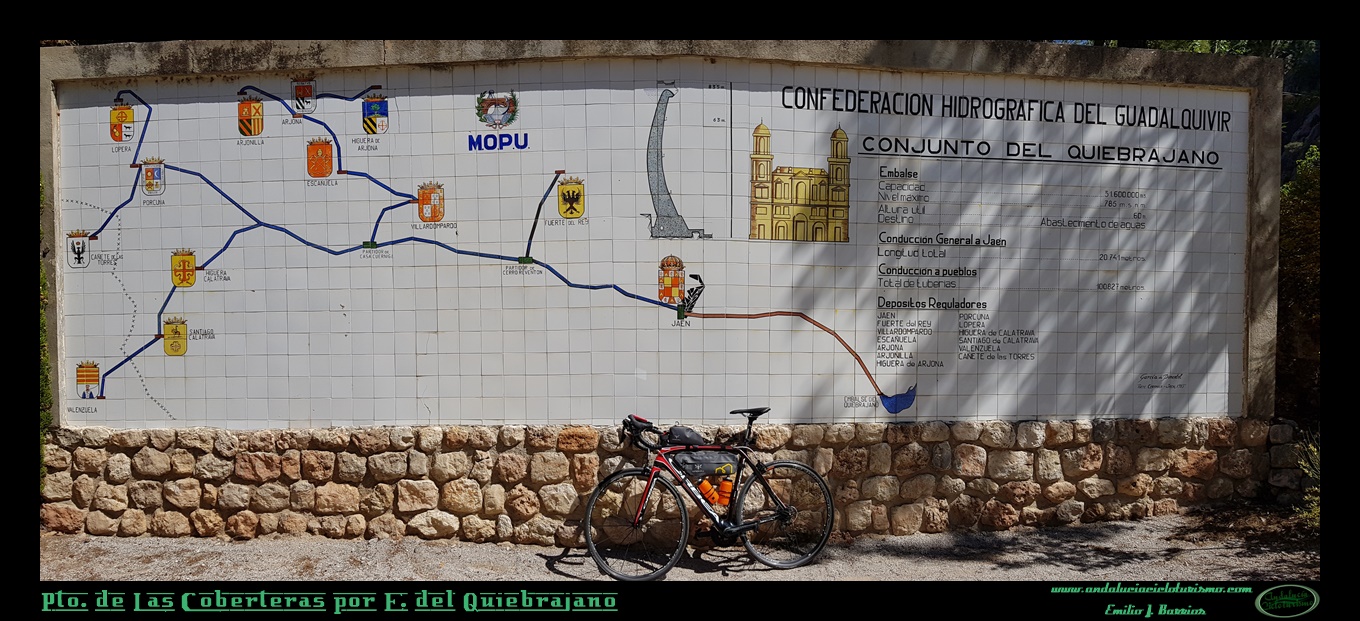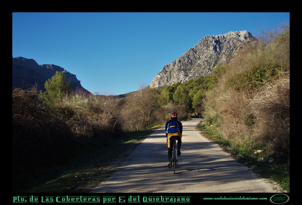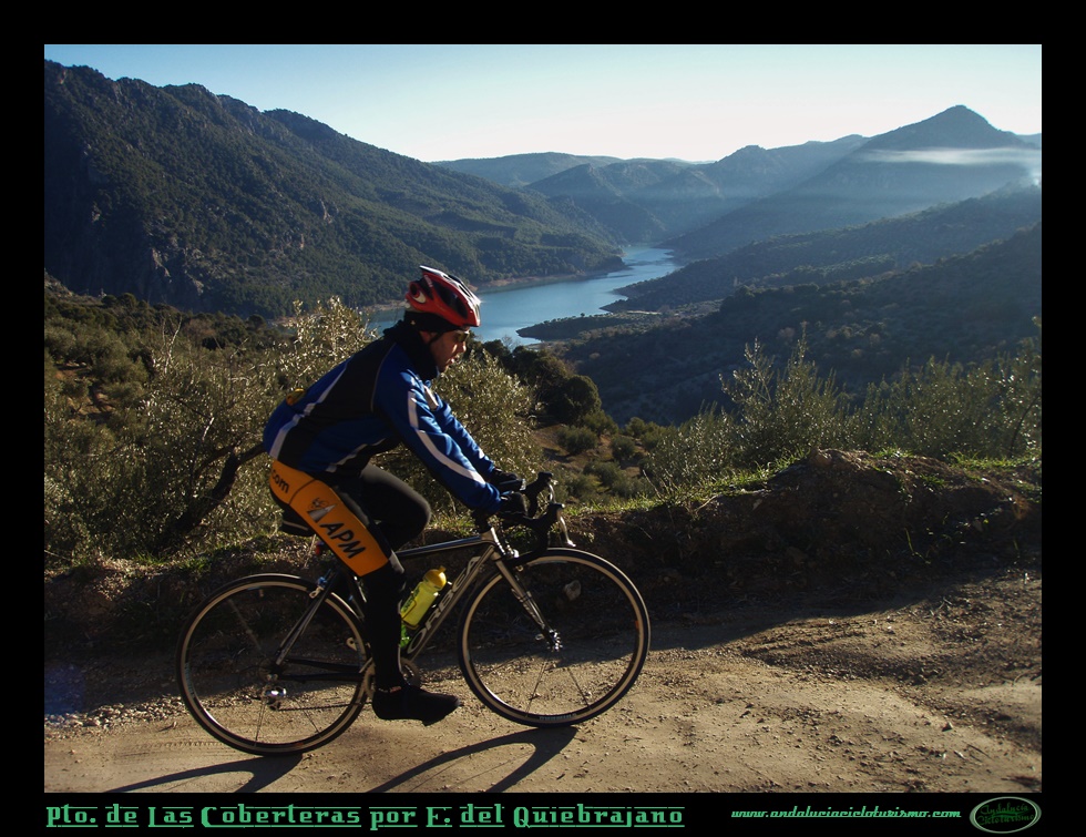 Superadas las rampas más duras, la carretera se abre paso ahora entre olivos al pie de la Sierra de la Pandera, que acapara nuestra atención hasta que tenemos visión directa hacia el embalse. Algo más adelante, entre las cumbres del alto de la Pandera y del Cerro de la Horca, atisbamos el amplio collado donde habremos de coronar Las Coberteras.