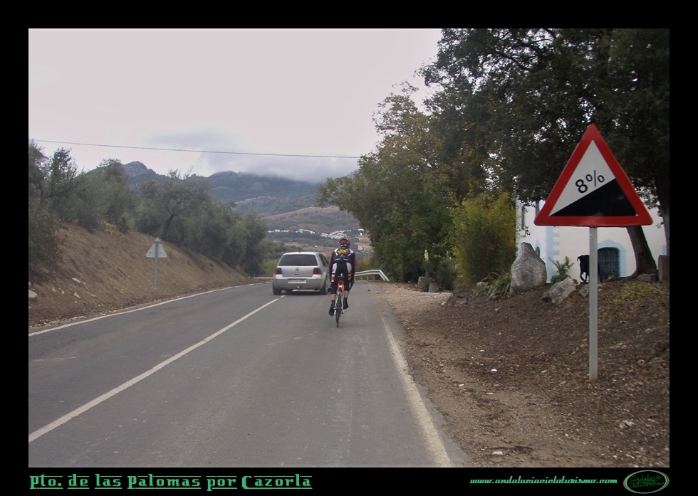 Pasado un arroyo, un cartel de 8% de pendiente nos pone sobre aviso. De momento será algo puntual y la pendiente volverá a bajar, incluso disfrutaremos de algún descenso más, pero enn el sexto kilómetro de ascenso el aumento de la pendiente será palpable, aunque falto de continuidad, mientras que en las inmediaciones de Cazorla la rampa termina de dispararse.
