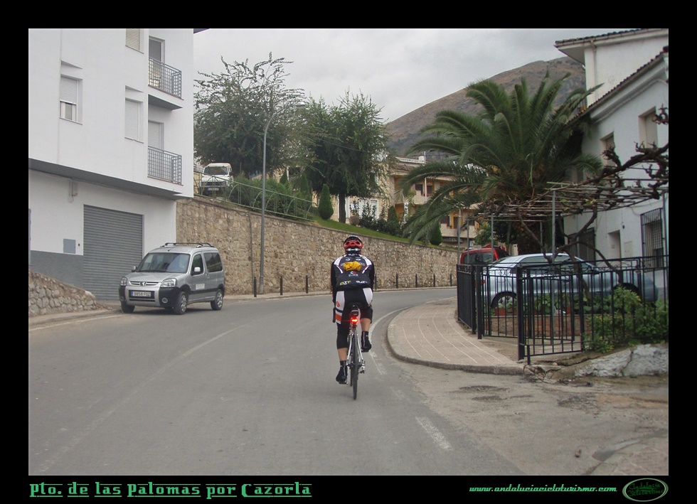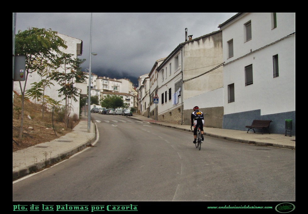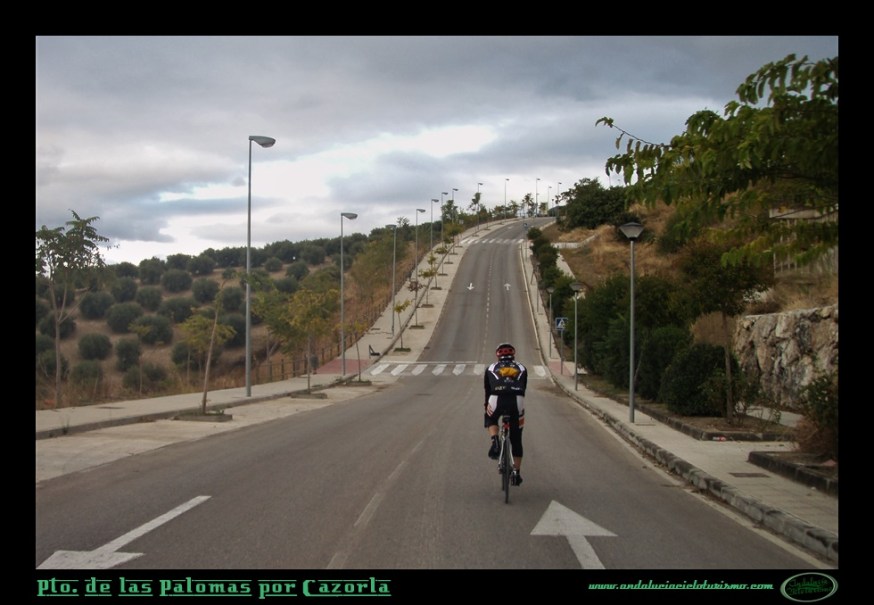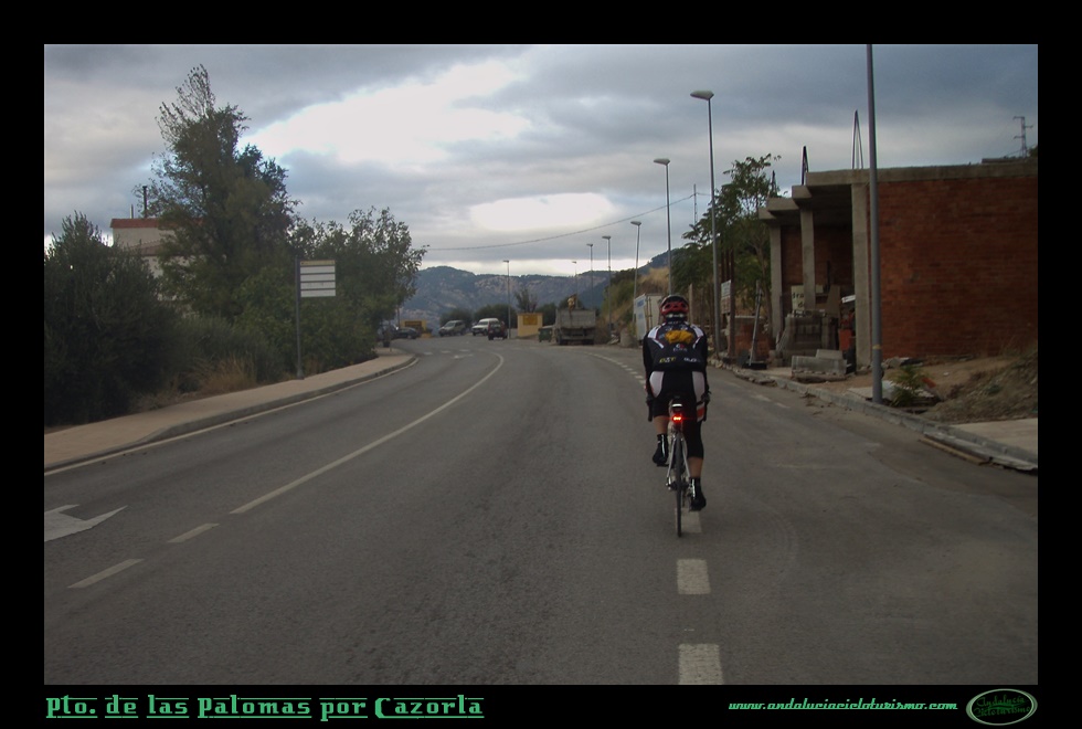 Será esta calle la que nos pondrá en mayores dificultades, sobre todo al torcer una curva a derechas en que la pendiente alcanza el 21%. Apenas ceja la cuesta que, en la siguiente curva, sigue al 17%. En semejante trance casi no tenemos tiempo de observar el entorno, más que para percibir -justo en un breve respiro- que circulamos por lo que nos parece una zona de nueva expansión del pueblo y que esta calle debe ser algo similar a una suerte de circunvalación. Acto seguido, un nuevo rampón dispara la pendiente nuevamente hasta el 20% y, al punto, volvemos a empalmar con la A-319 ya fuera del casco urbano de Cazorla. La variante escogida ha sido corta, pero intensa, desde luego y, de camino, hemos evitado el tráfico interno del pueblo.