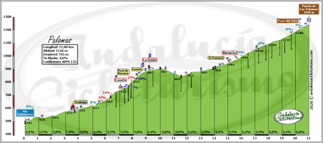 Desde este punto el puerto no nos va a plantear mayor dificultad que la de ir sumando uno tras otro los kilómetros restantes hasta el total de 21 de que consta hasta su cima. Pero nos encontramos ya en una zona bastante elevada sobre el valle, con el profuso olivar a nuestros pies y aun todavía a la vera de la carretera, que se dispone a culebrear a media ladera marcando, aún durante algunos kilómetros, la franja entre la zona de cultivo y el bosque, pero ganando en belleza kilómetro a kilómetro, sobre todo al salir de La Iruela, que es la siguiente localidad que vamos a atravesar, vecinísima a Cazorla.