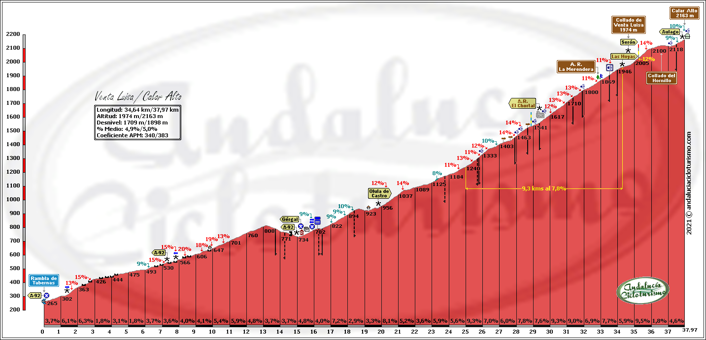 Ascendido en varias ocasiones por la Vuelta a España desde Gérgal (2004 y 2006), esta vertiente de Calar Alto lleva abierta desde finales del pasado siglo y va camino de cumplir 15 años desde la última vez que se coronó, aunque ha repetido también como final en varias ocasiones por su vertiente de Bacares.