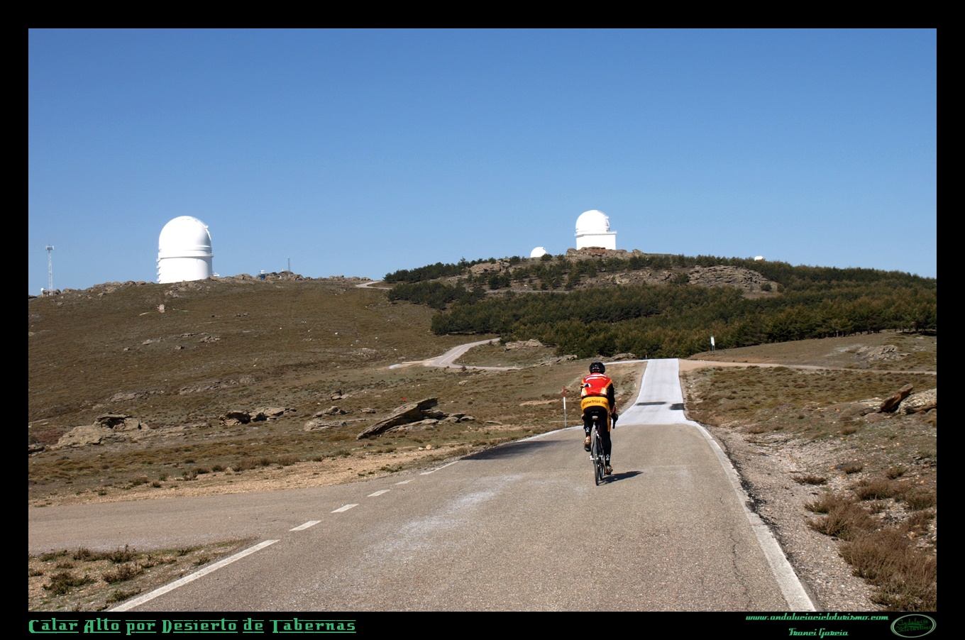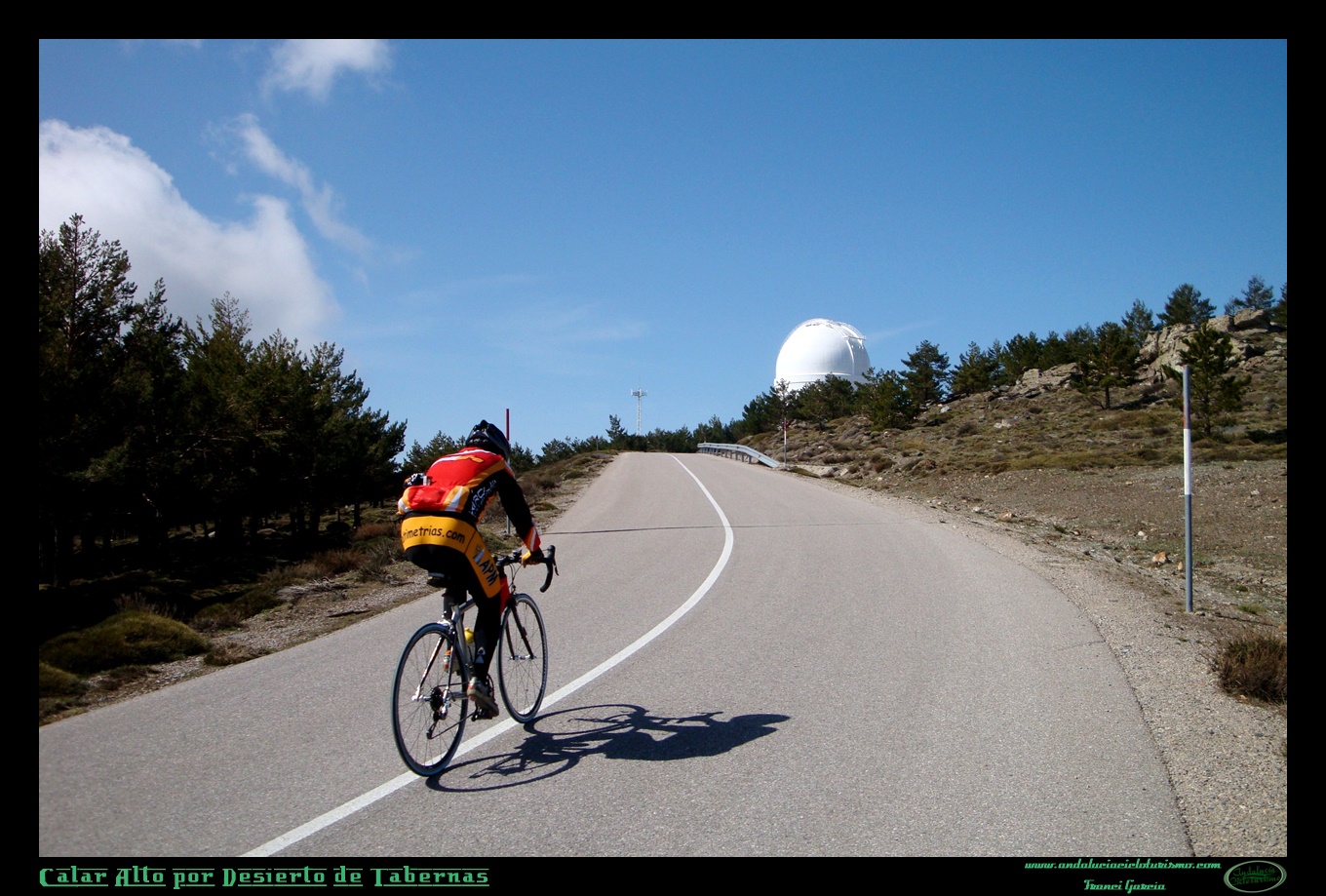 Este ascenso, por su parte, te va estrangulando como una boa, asfixiándote poco a poco, haciendo notar el paso y el peso de los kilómetros, del desnivel acumulado, poniendo a prueba nuestra fortaleza mental ya desde el inicio en que atisbábamos lejanas las blancas cúpulas del observatorio astronómico y que seguiremos atisbando siempre distantes a nuestro ojo, pese a que somos racionalmente conscientes de que estamos más cerca. No en vano, en el territorio nacional sólo encontramos puertos de este calibre (1.900 m. de desnivel, rondando los 2.000 m. de acumulado) en la vecina provincia granadina y en las islas afortunadas… Estamos, pues, ante un ascenso singular. Un reto.