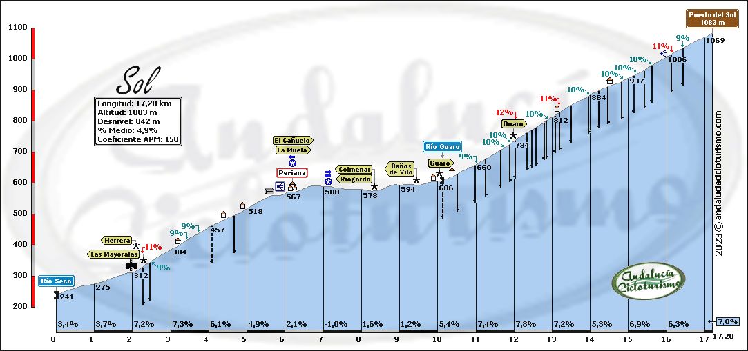 Sírvenos este puente como referencia del inicio de las hostilidades. Si hasta ahora el ascenso ha sido cómodo, en este punto, tras un giro a la derecha, la carretera se empina y se retuerce en una doble curva a derecha e izquierdas donde la pendiente media rondará el 8% y la máxima el 11%. La situación se “normaliza” cuando las rampas se sitúan en torno al 7% hasta Periana.
